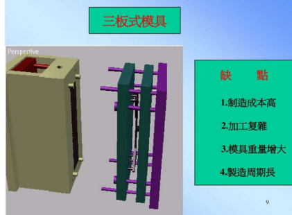 细水口华体会在线开户-华体会(中国)又叫三板式华体会在线开户-华体会(中国),的流道及浇口不在分型线上,一般直接在产品上,所以我们在设计的时候多一组水口分模线,设计较为复杂,加工较困难,一般要视产品和客户要求而选用细水口系统。这种华体会在线开户-华体会(中国)的浇口位置选择的地方比较多,而且开模时流道浇口与产品会自动分开,也省去了剪浇口这一步骤,被称呼为三板式华体会在线开户-华体会(中国)