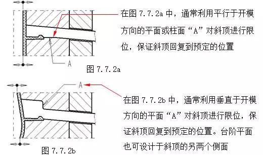 在斜顶机构中,为了保证斜顶工作稳定、可靠,应该注意以下几点:(A)斜顶的刚性。增强斜顶刚性一般采用:1.在结构允许的情况下,尽量加大斜顶横断面尺寸。(参见第七章7.2节)2.在可以满足侧向出模的情况下,斜顶的斜度角“A”尽量选用较小角度,斜角A一般不大于20°,并且将斜顶的侧向受力点下移,如增加图7.7.1a中的镶块2,同时镶块可以具有较高的硬度,提高 华体会在线开户-华体会(中国) 的寿命。(B)斜顶横向移动空间。如图7.7.1a所示尺寸“D”,为了保证斜顶在顶出时不与胶件上的其它结构发生干涉,应充分考虑斜顶的侧向分模距离、斜顶的斜度角“A”,以保证有足够的横向移动空间“D”。(C)斜顶在开模方向的复位。为了保证合模后,斜顶回复到预定的位置,一般采用下面的结构形式。如图7.7.2a;7.7.2b。